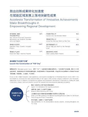 in education, science, talent and industry" around FGF research and industrialization nationally and globally. 组织40余位第十八届中国青年科技奖获奖者等青年科技领军人才开展地方产业对接活动。